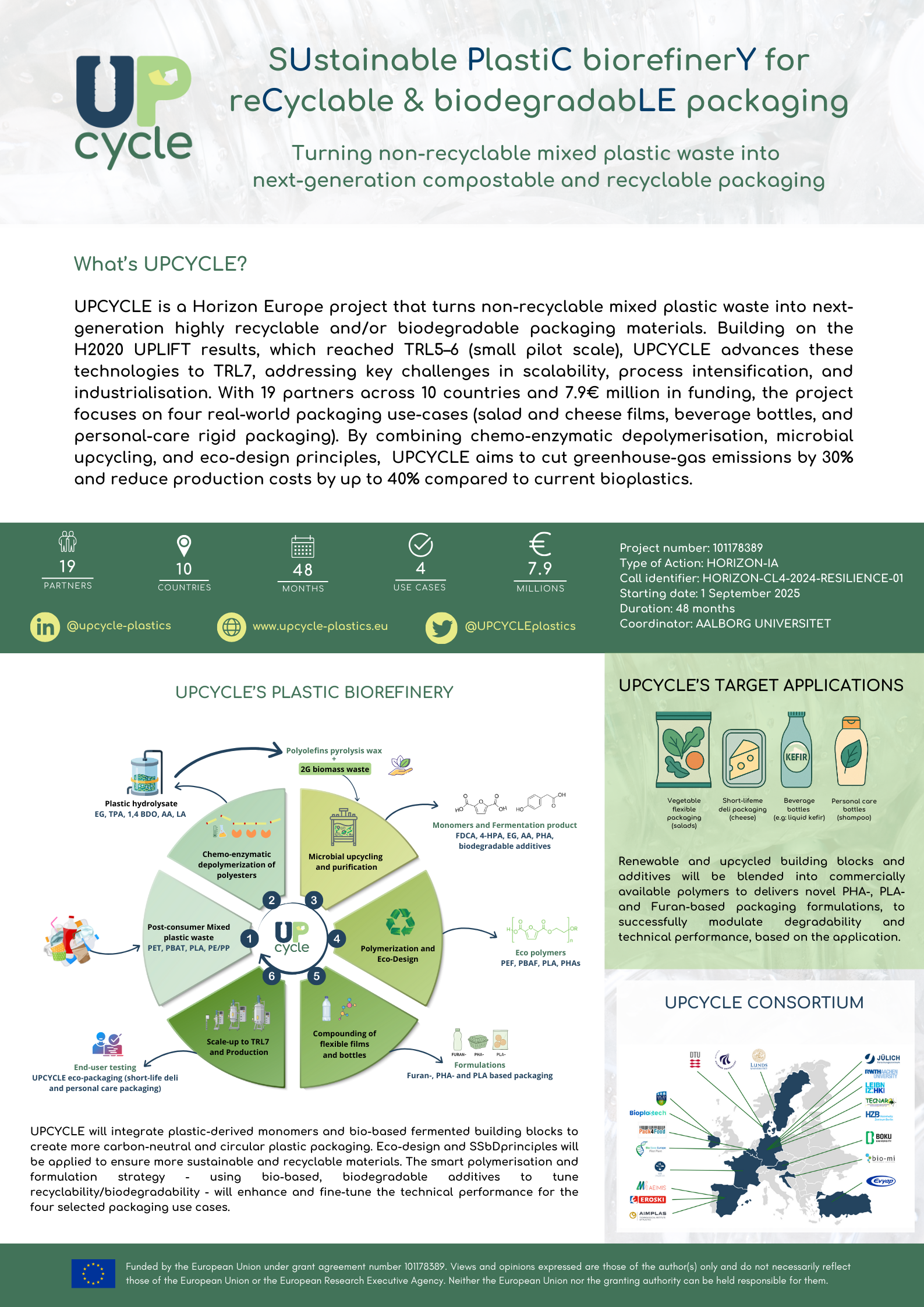 Funded by Horizon Europe under the European Health and Digital Executive Agency (HADEA), project number 101178389, the UPCYCLE project is developing novel circular value chains to transform non-recyclable plastic waste into highly recyclable and non-persistent packaging solutions.